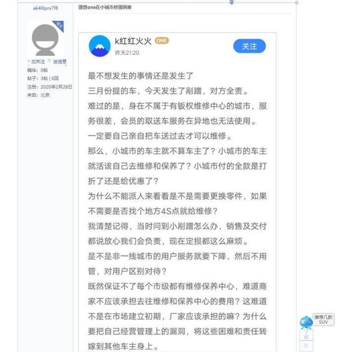 作为新兴车企,理想汽车在营业网点建设上目前还比较欠缺,网点少/维修保养不便也是不少车主主要不满意的地方。例如上图中的这位车主在发生事故后就出现了定损时间长、维修保养不便的情况。此外,理想ONE由于是销量很少的小众车型,零配件供应和供货周期也比较慢,这也会影响车辆修复进度和车主用车。