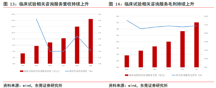 主要包括数据管理及统计分析、临床试验现场管理SMO及受试者招募、医学影像以及子公司方达控股提供的实验室服务。从2014年至2019年,相关咨询服务营收从3.34亿元上升到14.46亿元,CAGR为34.06%,近几年临床试验相关咨询服务毛利率维持48%附近水平。