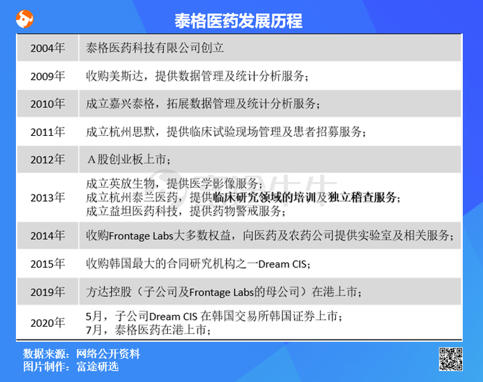 泰格医药在2004年开始成立,2012年在A股的创业板上市,2020年7月在香港上市。2014年收购方达控股Frontage Labs(提供医药和农药实验室相关服务),2015年方达控股在港上市。2015年收购韩国最大的合同研究机构Dream CIS,2020年5月Dream CIS在韩国证券交易所上市。