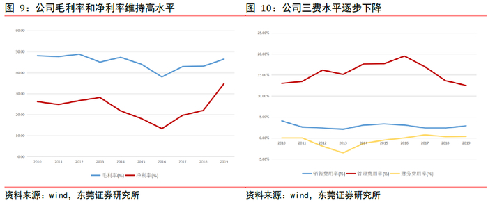 盈利能力稳步提升,三费控制得当。2019年公司毛利率达到46.48%,同比+3.37%;2019年净利率达到34.79%,同比+12.76%,毛利率和净利率提升主要是由于营收大增和投资收益上升。
