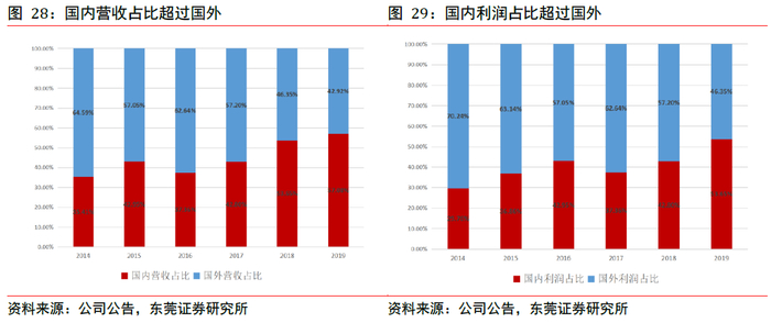 由于国内BE试验和创新药临床需求大增,未来国内业务增量有望维持高增长,而国外业务有望维持稳定增长。从2014年至2019年,国内营收占比从35.41%提升至57.08%,利润占比从29.76%提升至53.65%,整体来看国内业务业绩占比已超过半数。
