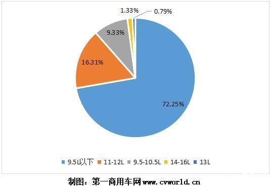 分排量来看,由于柴油车国六排放法规先在城市车辆中推行,因此,今年上半年的国六柴油重卡发动机销量中,10L以上排量动力占比不高。如果分析国六重卡销量整车占比结构即可看出,在重卡的四大品种中,国六柴油专用车和载货车这两大品种的占比是最高的,柴油牵引车和自卸车占比相对较低。其中原因主要在于城市类专用车以及一部分城市类货车要提前于今年7月1日起实施国六,因此部分重卡用户考虑一步到位,直接购买国六重卡新车。在为国内重型专用车和载货车配套的柴油动力中,10L及以下排量的发动机比例比较高,占主体地位,因此,这也就不难解释为什么上半年9.5L以下排量发动机占到了72.25%的比例,9.5-10.5L排量发动机占了 9.33%,而11L及以上排量发动机合计占比18.43%。