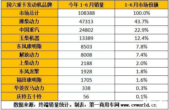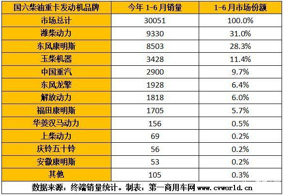 今年1-6月国六柴油重卡发动机销量排行(单位:台)