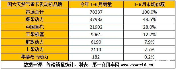 今年1-6月国六天然气重卡发动机销量份额图