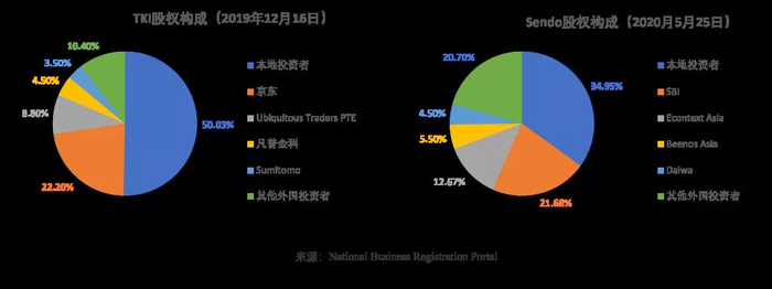 Tiki 和 Sendo 两边的股东关系都不简单,外资股东占大多数。根据 National Business Registration Portal 的资料显示,Tiki 最大的外资股东是京东,持股 22.2%。但据 VnExpress 于 2019 年 8 月报道,越南互联网巨头 VNG 在 Tiki 的持股比例已从 28.8% 降至 24.4%,京东持股增至 25.65%,成为 Tiki 最大股东。而 Sendo 的外资控股高达 65%,不过最大股东是越南 IT 公司 FPT,紧接着的第二大股东是日本集团 SBI。