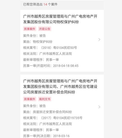 据企查查显示,在广电地产涉及到的14起司法案件中,案件原有多为财产损害赔偿纠纷、房屋超前安置补偿合同纠纷、无权保护纠纷、房屋买卖合同纠纷、劳动争议等。