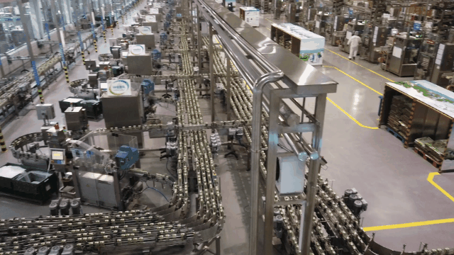 在伊利液态奶生产基地,现代化生产线和机器人几乎替代了绝大部分人工。康美灌装设备和利乐灌装设备保证了全程高效无菌;运输用的是一台可以顶60个人工的码垛机械手;仓储环节,拥有亚洲自动化程度最高、规模最大的立体仓储系统……