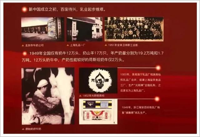 1949年新中国成立时,全国仅有奶牛12万头、奶山羊17万只,年产奶量21.7万吨,人均奶类占有量0.4千克,平均一个人一年还不到两盒。