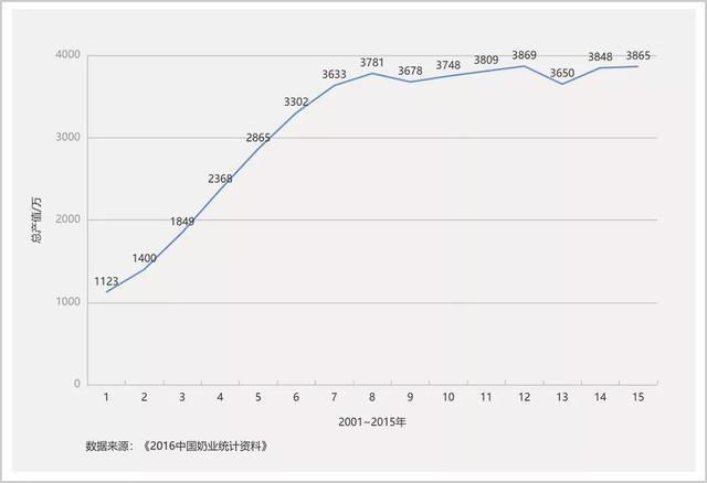 这是中国乳业发展史上的关键节点。2001年我国奶类总产量和牛奶产量双双突破1000万吨,2004年双双突破2000万吨,2006年、2008年先后突破3000万吨,6年突破三个千万吨级台阶。