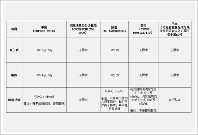 综合蛋白质、脂肪和菌落总数三大指标来看,中国标准比美国、日本都严格,只是略低于欧盟标准。