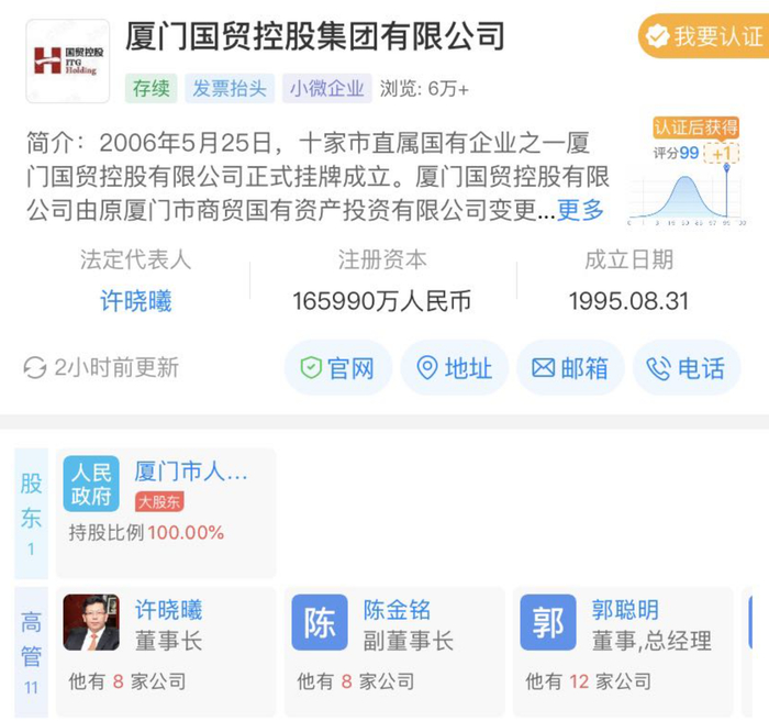 天眼查信息显示,厦门国贸控股是由厦门市国资委下辖的地方国有企业,拥有厦门国贸集团股份(600755)和厦门信达股份(000701)两家上市公司。