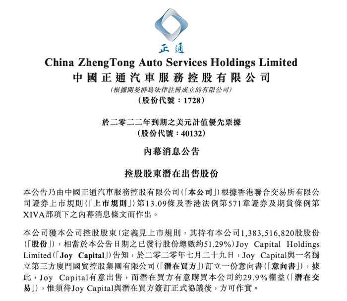 7月31日,正通汽车(01728.HK)发布公告称,董事长王木清家族信托全资持有的子公司Joy Capital Holdings Limited(以下简称Joy Capital)与厦门国贸控股集团有限公司(以下简称厦门国贸控股)订立一份意向书。