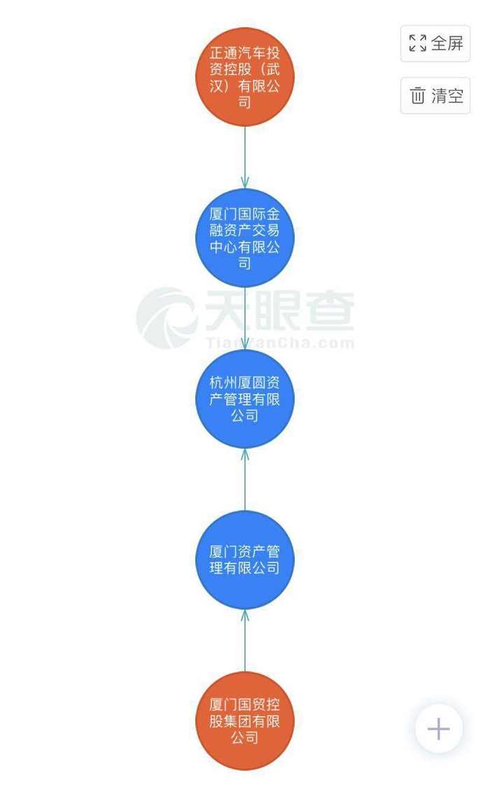 事实上,正通汽车与潜在金主厦门国贸控股之间存在着股权上的关联。天眼查信息显示,正通汽车投资控股持有厦门国际金融资产16%的股份,后者持有杭州厦圆资产管理20%的股份,因此正通汽车投资控股间接持有杭州厦圆资产管理3.2%的股份;另一方面,厦门国贸控股持有厦门资产管理37.5%的股份,后者持有杭州厦圆资产管理40%的股份,因此厦门国贸控股间接持有杭州厦圆资产管理15%的股份。