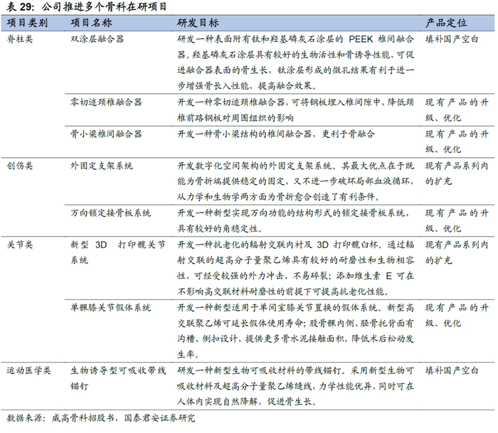 公司研发中心以脊柱、创伤、关节和运动医学领域作为研发方向,开展多项研究,其中部分产品用以填补国产空白,打断进口垄断;部分产品用以升级优化市场现有产品。例如,目前国内尚无双涂层融合器同类已上市产品,公司在研项目钛和羟基磷灰石涂层的双涂层PEEK 融合器可极大促进融合效果,加速骨长入到假体的多孔表面内。产品的更新换代将有利于公司巩固在国产骨科领域的龙头地位,持续扩大市场影响力。