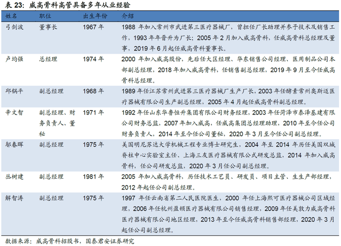 根据标点信息的相关研究报告,2019年公司骨科业务销售规模位居国产第一。各细分领域均排名靠前,其中,脊柱、创伤、关节三类产品市场份额分别位居国内厂商第一、第二和第三,在各国产骨科龙头公司中产品线最为均衡,具有领先的市场规模和行业地位。但市场份额不到5%,行业竞争格局分散,仍有较大份额提升空间。在国内企业中,威高凭借产品线齐全、研发优势和销售渠道优势等竞争优势,市场影响力和品牌知名度逐步扩大,占据较大市场份额,处于行业领先地位。