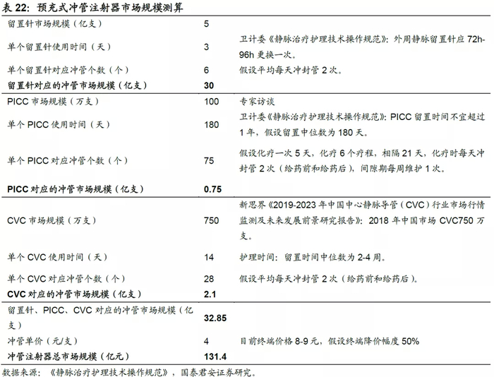 目前国外已普遍使用预充式冲管注射器,而国内目前主要需求在三级医院,且受到耗占比、医保控费控制,国内市场规模仅约15亿元。根据留置针、PICC管、CVC管使用量测算,即便纳入带量采购降低产品终端价格50%,中国冲管注射器市场空间仍有131.4亿元,仍有较大渗透率提升空间,行业正处于快速增长阶段,威高作为行业龙头有望率先受益。