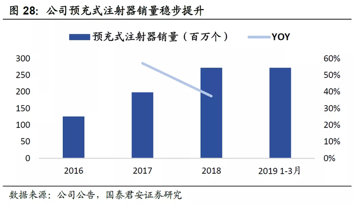 产品包括预灌封注射器、冲管注射器。2019年公司药品包装业务实现收入12.81亿元,占公司营业收入的12.36%,同比增长34.1%。其中预灌封注射器进一步扩大在生物制药包装领域的市场影响力,冲管注射器继续保持高速增长。为了进一步满足不断增加的市场需求,公司持续扩大产能,2019年继续扩建了预灌封注射器、冲管注射器车间等生产设施,后续有望继续保持快速增长。