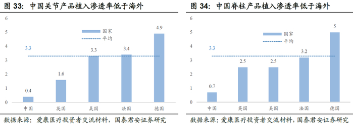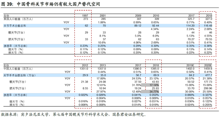 根据第七届中国髋关节外科学术大会数据,2018年中国髋、膝关节手术量分别为43.93、25.93万台,植入渗透率仍远低于美国2018年水平,其中髋关节植入渗透率约为美国的1/5(0.031%vs.0.14%),膝关节渗透率约为美国的1/12(0.019%vs.0.22%)。与髋关节相比,膝关节国产替代空间更大,若以2018年中国髋、膝关节植入手术量增速预测未来手术量增长,有望在在2028年关节植入渗透率与美国相当,中国骨科关节市场仍有较大发展空间。