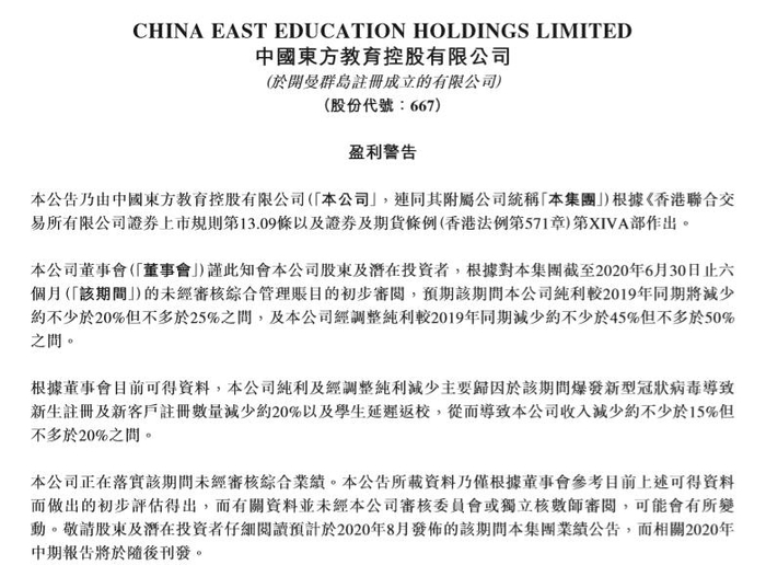 7月31日,中国东方教育(00667.HK)发布盈利警告称,2020年上半年,预计纯利减少20%-25%,经调整纯利减少45%-50%。