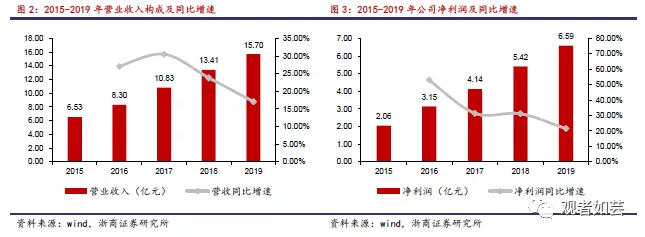 公司营收从2015年的6.53亿元增长至2019年的15.70亿元,年复合增长率为24.53%;对应净利润从2015年的2.06亿元增长至2019年的6.59亿元,年复合增长率为33.83%,实现持续较为稳定的增长。