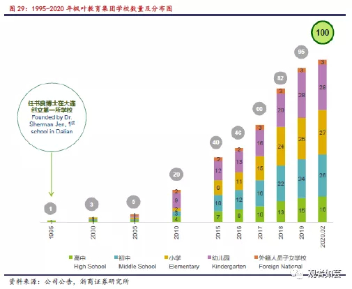 自公司创始人任书良博士1995年在大连创立第一所学校至今,枫叶教育集团已在K12国际教育领域拥有25年办学经验,截止到2月28日,建校总数达100所,其中高中16所、初中26所、小学27所、幼儿园28所和外籍人员子女学校3所。