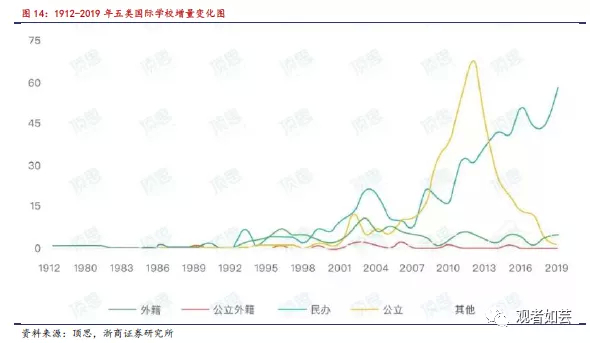 随着留学低龄化的加速,2005-2013年公办学校国际班发展迅速,2011-2013期间每年新增审批数量超过50个;但由于该领域办学野蛮生长,存在诸多收费不规范、办学质量良莠不齐的问题。2013年,教育部加强高中阶段涉外办学管理工作,停止审批公办高中新的中外合作办学项目,公办学校国际班将停止扩大招生或转为民办,民办国际学校迎来高速发展的黄金期。