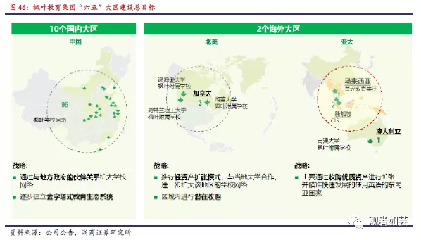 在六五规划指导下,枫叶教育加快亚太大区扩展步伐,于2020年1月29日公告3.91亿元收购马来西亚国际学校皇岦(Kingsley)100%普通股,并于2020年6月22日公告4.4亿新币(约22亿人民币)收购新加坡最大盈利性国际学校CIS共2个校区,并购完成后,枫叶集团将完成亚太大区初步战略规划。届时,枫叶教育将形成“10个国内大区,北美、亚太2个海外大区”战略布局,通过大区内幼、小、初、高层层递进的金字塔结构,实现生源自给自足的完整生态,在未来5年内实现11万学生的扩展目标。