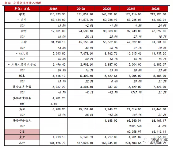 假设2:公司继续实施积极的海内外扩张政策,业务推进较为顺利。按照公司六五规划,在未来5年内,学生总数将增长至超过11万人,其中海外学生总数将增长至约1万人,国内学生总数将增长至约10万人;其中,高中学生增长至1.6万人,初中学生增长至2.6万人,小学学生增长至4.8万人,幼儿园学生增长至近1万人,外籍人员子女学校学生增长至约1000人;