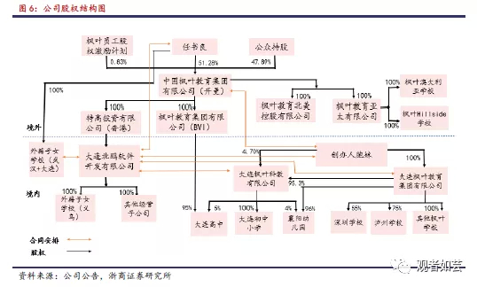 枫叶教育创始人任书良博士持股51.28%,为公司实际控制人,公众股东持股占比47.89%,集团通过VIE协议架构下特高投资间接持有北鹏软件获取境内各学校的收益。