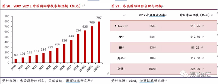。按新学说2019年各类国际课程中国市占率测算细分课程市场规模:1)A-level课程35%市占率最高,对应218.75亿元市场规模;2)AP课程市占率34%,对应212.50亿元市场规模;3)IB课程市占率相对前两者较低,占比13%,对应81.25亿元市场规模;4)加拿大及澳洲等其他国际课程总市占率为18%,对应112.50亿元市场规模。