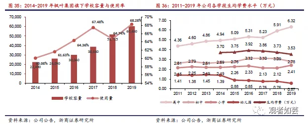 集团过去五年的学校容量呈稳步增长趋势,五年复合增速21.85%,截至2020财年上半年,枫叶学校容量达64,620人;校舍使用率稳步提升,于报告期达68.28%。从各学段学费水平看,整体低于同行水平,有很大提升空间。目前公司内生业绩主要基于小学、初中人数较快增长带动,随着近年新开校区的逐步成熟,整体校舍使用率有望持续提升,品牌声誉提升有望进一步支撑学费上调,增厚内生业绩。