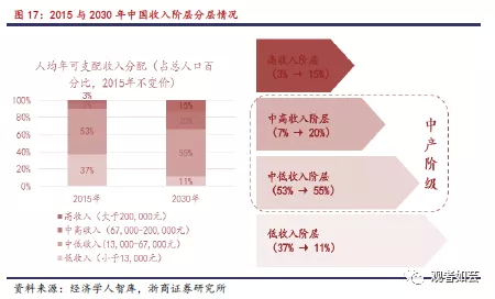 根据人均年可支配收入分配划分,2015年高收入阶层及中产阶级(包括中高收入阶层与中低收入阶层)消费人群占比63%,预计将在2030年提升至90%;其中,高收入阶层占比从3%提升至15%,中高收入阶层占比从7%提升至20%,中高收入阶层整体占比扩大显著。