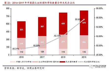 根据新学说发布的《2019中国国际学校发展报告》数据,民办国际学校数量呈现逐年稳步增长态势,从2016年的321所增长至2019年的479所,对应占比从2016年的49.31%提升至2019年的55.63%,