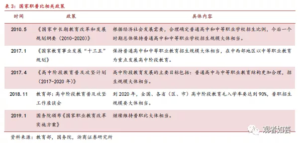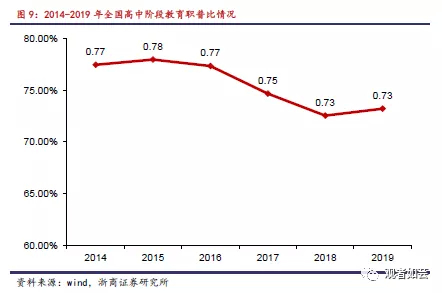 根据国家统计局数据测算,2019年全国高中阶段教育职普比例约为0.73,距离“大体相当”的政策目标仍有一定提升空间。