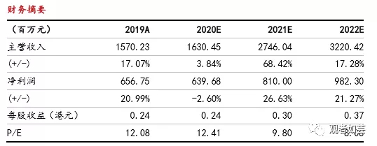 我们预计2020-2022财年公司收入同比增长3.84%/68.42%/17.28%至16.3/27.5/32.2亿元,归母净利润为6.40/8.10/9.82亿元,同比增长-2.60%/26.63%/21.27%,对应PE估值12.41/9.80/8.08倍。