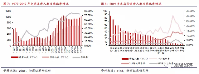 1999年实施高考扩招以来,全国高考报名人数呈现大幅提升态势,2008年达到1050万人的峰值随后逐步回落,至2014年止跌并持续稳定在940万人左右规模,自2018年开始出现明显增长。根据教育部公布数据,2019年全国高考报名人数1031万人,同比增长5.74%,增幅明显,再次突破千万大关。