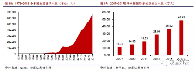 2018年,我国出国留学人员总数为66.21万人,较2017年的60.84万人实现同比增长8.83%,2013-2018年出国留学人数保持9.9%的年复合增长。国际学校在校生人数从2007年的11.78万人上升至2017年预计的48.43万人,十年间的年复合增长率达15.19%。