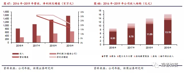 2016、2017、2018、2019财年管理费用分别为1.22亿元、1.55亿元、1.56亿元、以及1.99亿元,占当年营业收入的比例分别为14.70%、14.31%、11.63%、以及12.68%。管理费用主要包括一般行政员工的薪资及其他福利、办公大楼及设备折旧、差旅开支、雇员买卖股权及若干专业开支。截至2019财年末,行政费用的增加主要是由于公司上调薪资福利28.1%,同时实施了有效的成本控制措施,使总的管理费用占营业收入的比例仅略微增加1%至12.7%。从销售费用上看:2016、2017、2018、2019财年销售费用分别为0.26亿元、0.30亿元、0.40亿元、以及0.34亿元,占当年营业收入的比例分别为3.13%、2.77%、2.98%、以及2.17%。销售费用主要由广告费、生产、印刷及派发广告及宣传品开支,以及销售及营销活动人员薪资福利组成。截至2019财年,营销开支占收入的比例进一步下降0.8%,主要由于广告及宣传开支以及招生相关开支占营业收入的百分比减少所致。