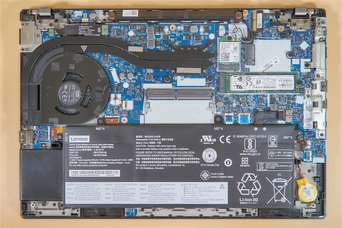拆机图,单风扇双热管的散热系统,电池容量是45Wh,有一条SO-DIMM插槽,因此有游戏需求的玩家可以根据实际需求购买8GB或者16GB的版本,然后再自行加装内存。