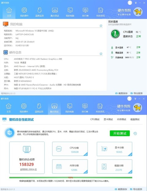 ThinkPad T14锐龙版的总分是158329,锐龙7 PRO 4750U的CPU分数为104508,Vega7显卡测得的分数是18365,磁盘分数23370。
