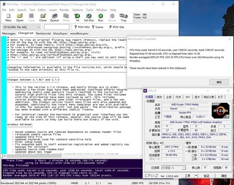 锐龙7 PRO 4750U的POV-Ray单核分数为440PPS,多线程成绩则为2879PPS。
