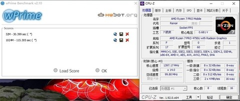 在wPrime 32M单线程性能测试中,锐龙7 PRO 4750U耗时30.4秒;多线程跑完wPrime 1024M则用掉了115秒。