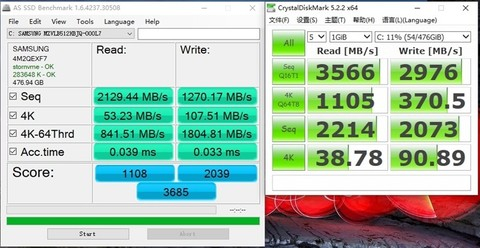 在AS SSD Benchmark中,这块PM981a 512GB的总分为3685,顺序读写超过2100MB/s、1200MB/s,4K随机读取52MB/s,随机写入107MB/s。