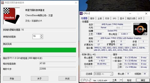 锐龙7 PRO 4750U在国际象棋测试中,性能倍数达到了47.68,每秒22886千步。