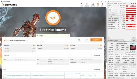 在3DMark Fire Strike Extreme的测试中,锐龙7 PRO 4750U的Vega7显卡的图形分数为971,在测试的过程中大多数时候都能保持1600MHz的运行频率,最高温度69度。