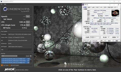 在CineBench R15测试中,锐龙7 PRO 4750U的单线程分数为179cb,多线程分数为1383cb。