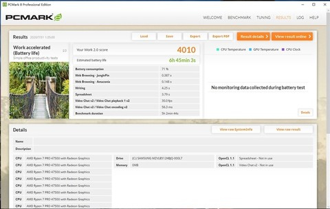 ThinkPad T14锐龙版内置了一块容量为50Wh的锂电池,我们用PCMark8来实际测试一下办公续航。电源模式为“更长的续航”、测试时关闭所有其他进程,关闭网络连接,屏幕亮度调为50%。