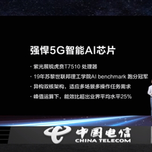资料显示,虎贲T7510采用8核CPU架构,由4颗2.0GHz的Arm Cortex-A75及4颗1.8GHz的Arm Cortex-A55组成,搭载主频800MHz 的IMG PowerVR GM 9446 图形处理器,在AI方面则是集成了独立的异构双核NPU,支持运行FP16、INT8、INT4等多种数据位宽的AI算法。算力达到了4TOPS,能效比 ≥ 2.5TOPS/W。在2019年年中曾以28097的高分位居苏黎世联邦理工学院AI Benchmark排行榜的榜首。此外,虎贲T710还整合了如4K@30fps编解码,802.11AC,BT 5.0等多媒体能力和双频Wi-Fi、蓝牙5.0等。同时虎贲T7510平台还外挂了展锐的首款5G芯片——春藤510,支持SA和NSA双模,支持Band 78、Band 79和Band 41三大主流5G频段,同时支持向下兼容2/3/4G网络。