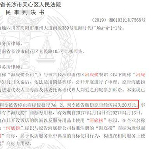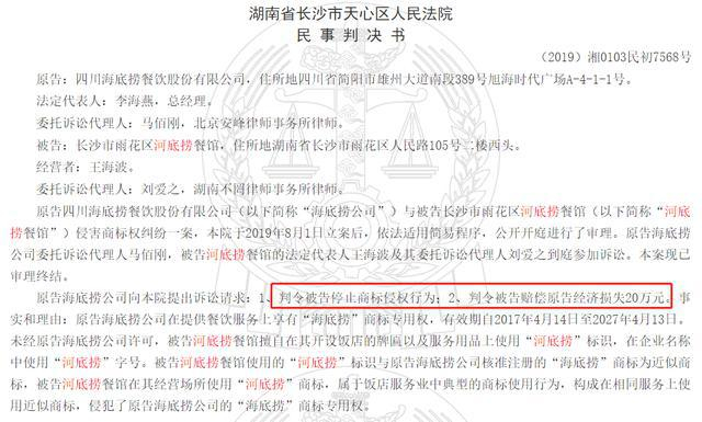 判决书显示,四川海底捞餐饮股份有限公司因侵害商标权为由,将长沙市雨花区河底捞餐馆告上法庭。海底捞向法院提出诉讼请求,要求判令河底捞停止侵权行为,并赔偿其经济损失20万元。