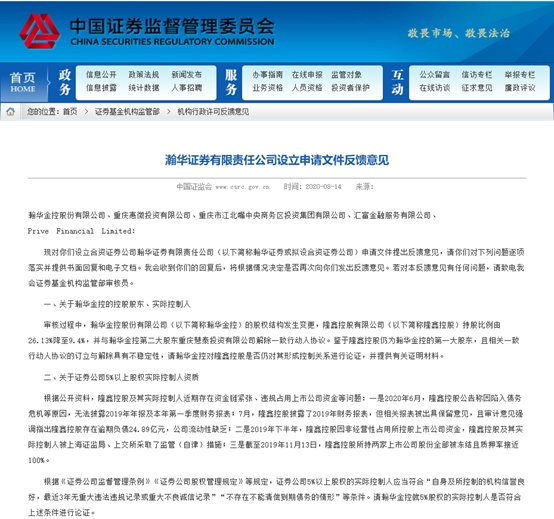 8月14日晚,证监会对瀚华证券的设立申请文件发出了反馈意见。证监会就瀚华证券的控股股东、实控人瀚华金控的股权变动、5%以上实控人资质、股东出资能力、控股股东的负债情况、僵局解决机制和港资股东的情况等6大方面提出疑问。